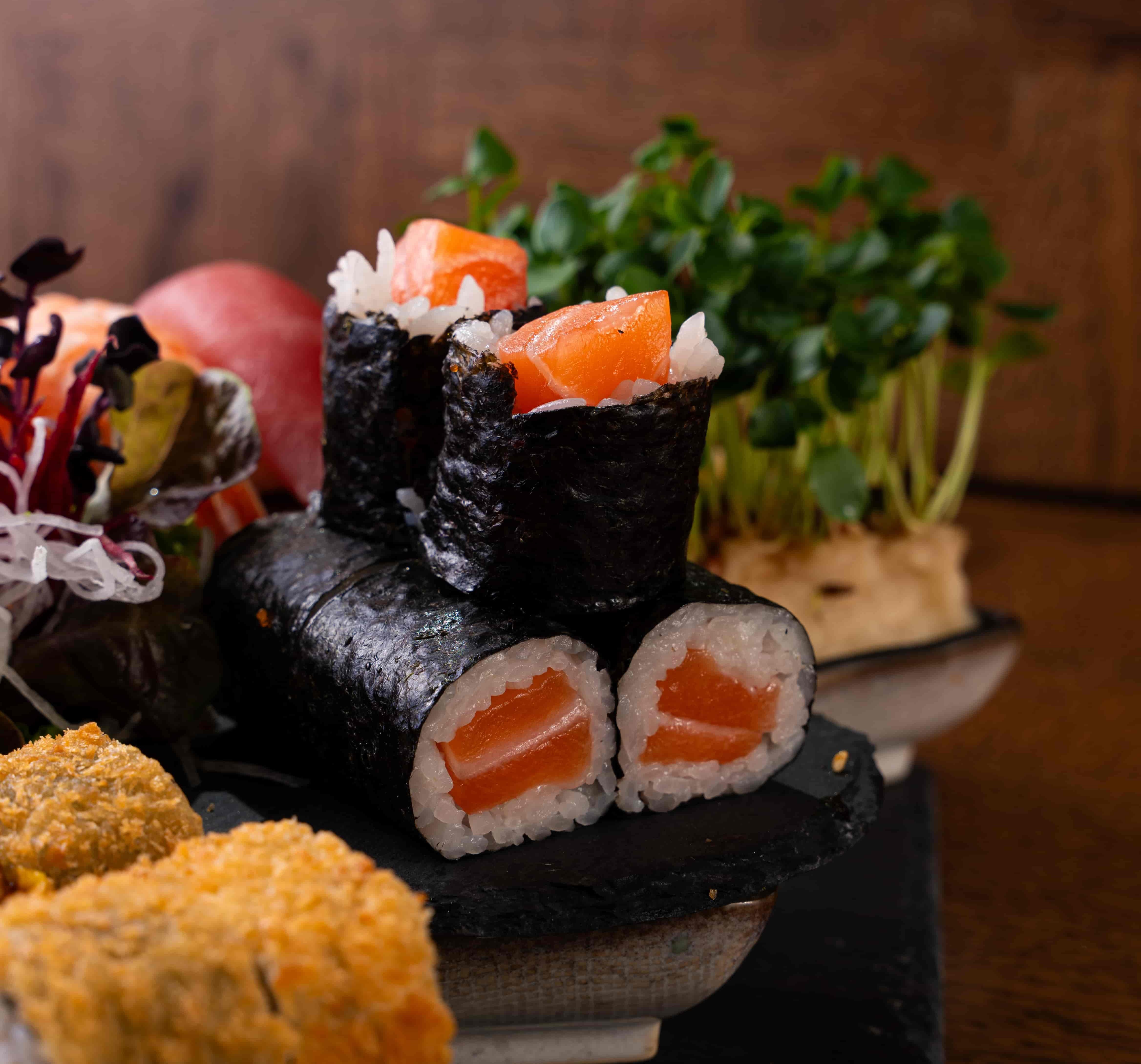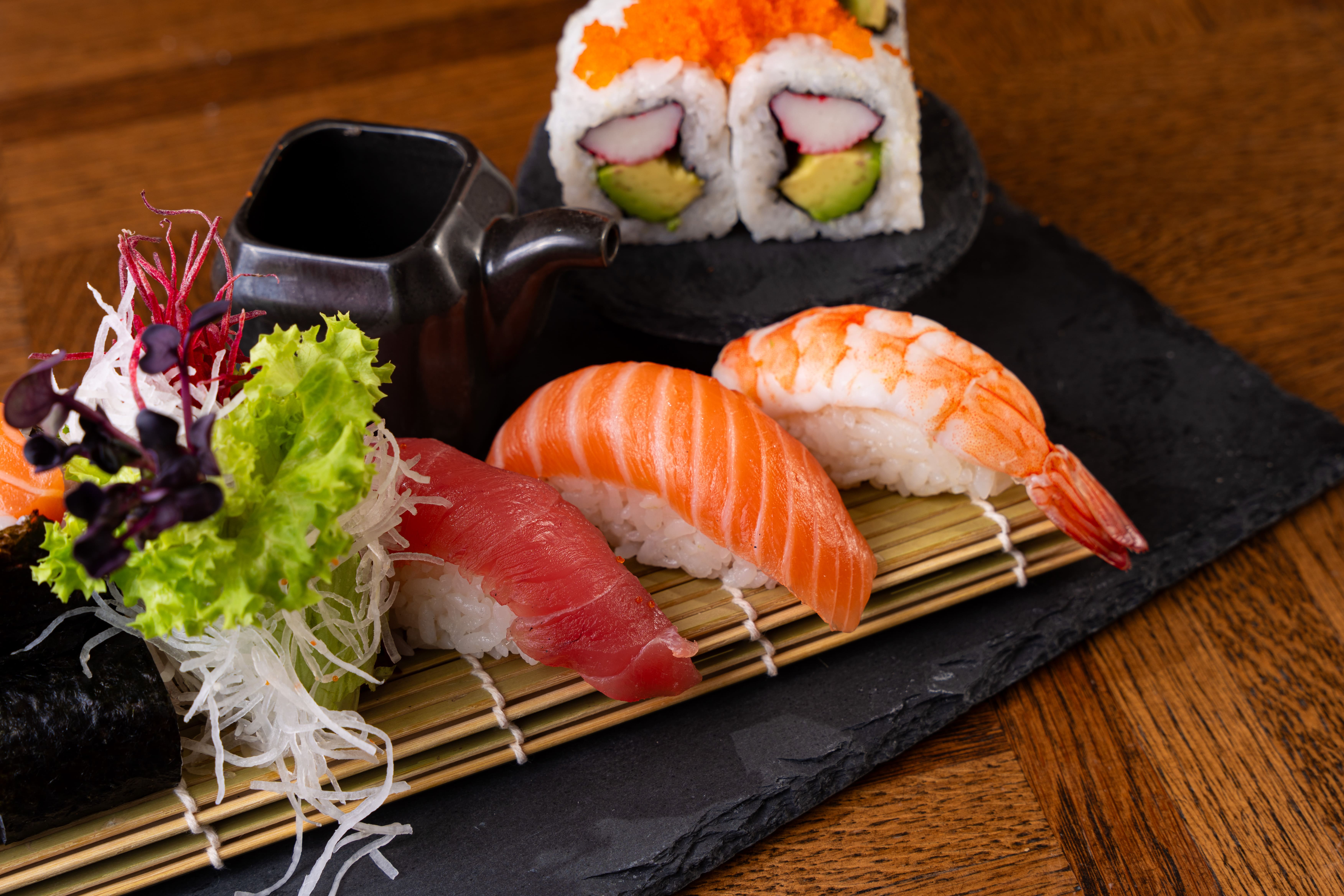6 Stk. Sake Maki, 6 Stk. California Maki, 8 Stk. Sake I.O, 8 Stk. Spicy Mini Rolls, 4 Stk. King Ebi Tempura, 4 Stk. Nigiri (2 Sake, 2 Thunfisch)