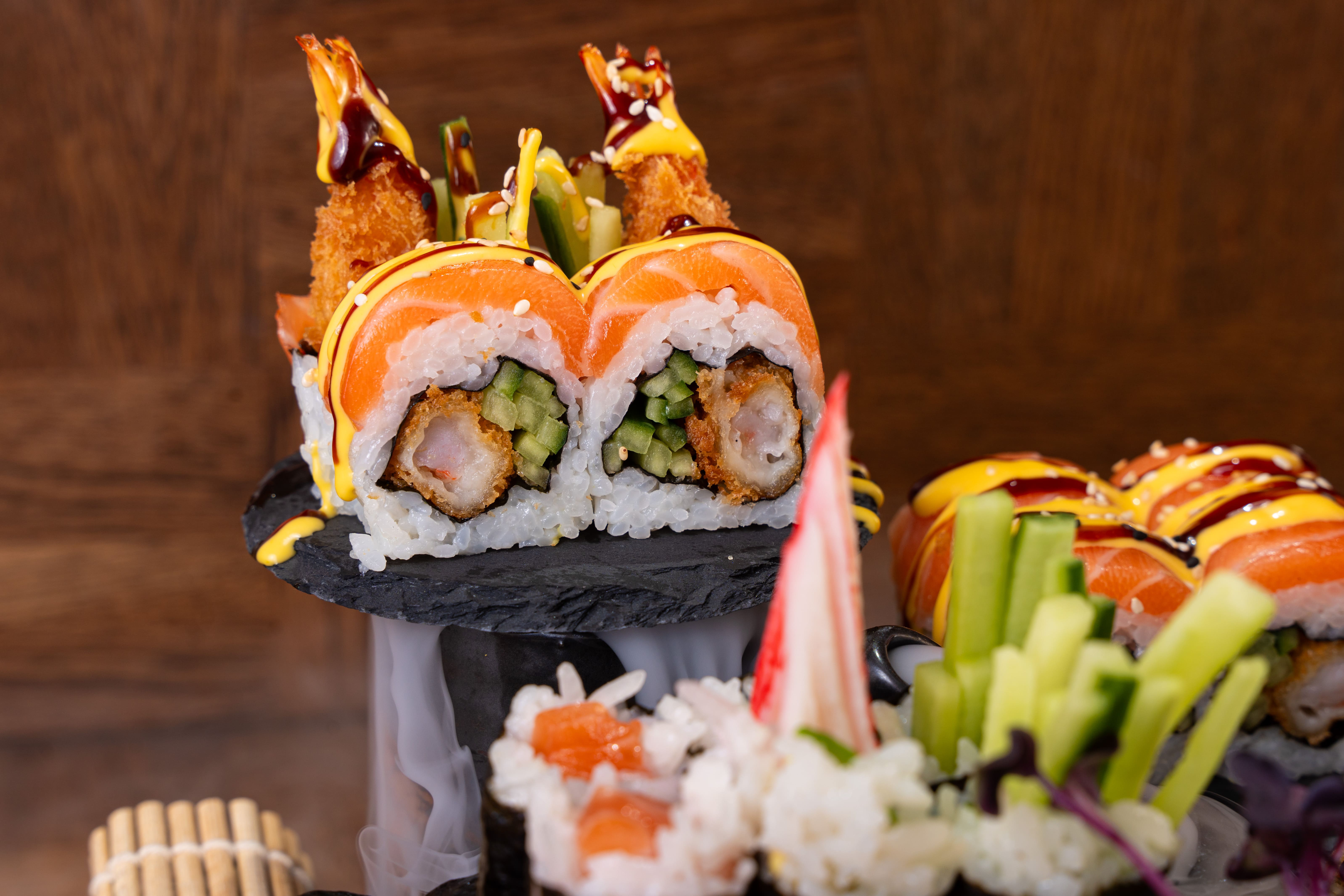 panierte Garnele, Gurke, Frischkäse umwickeltmit Lachs