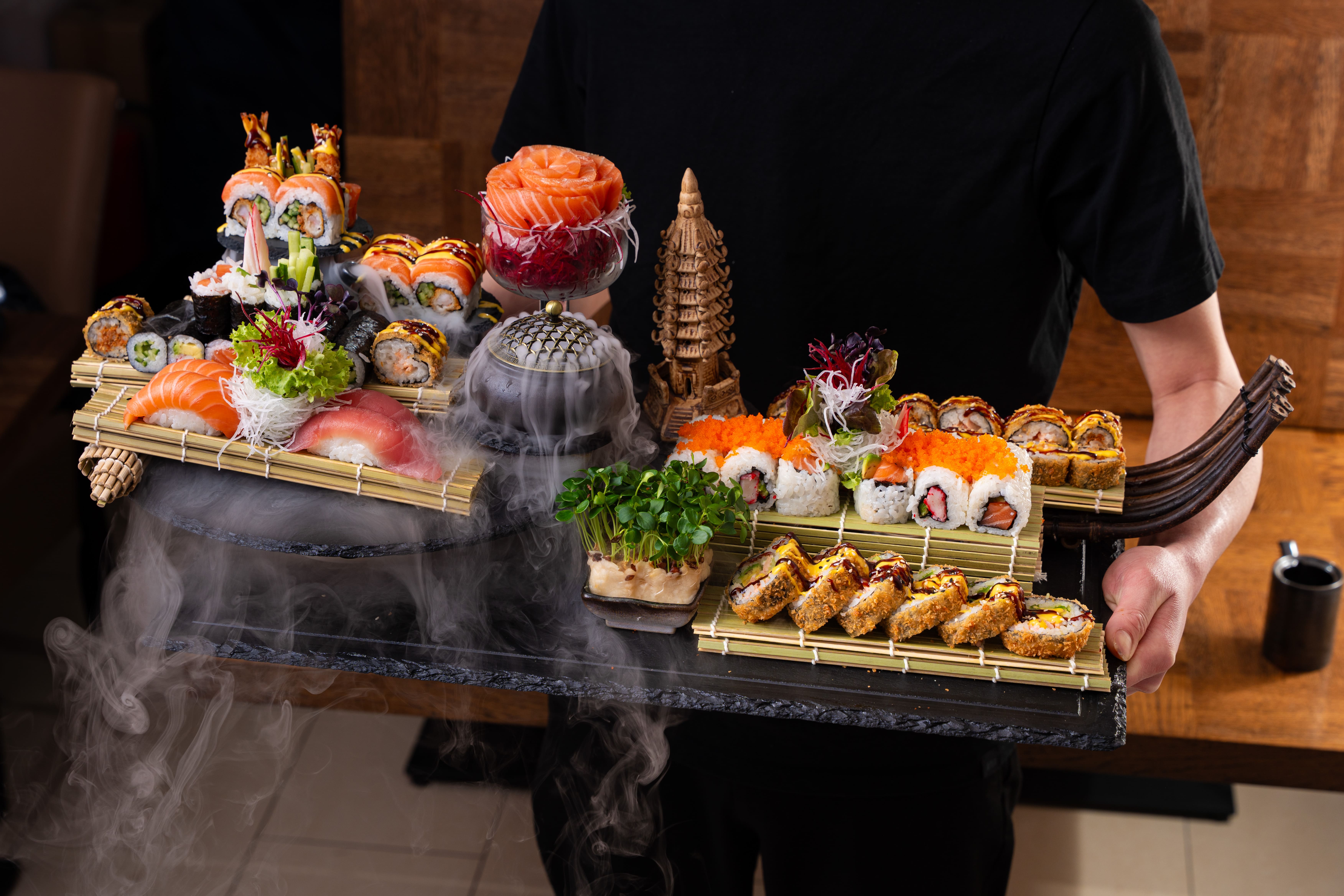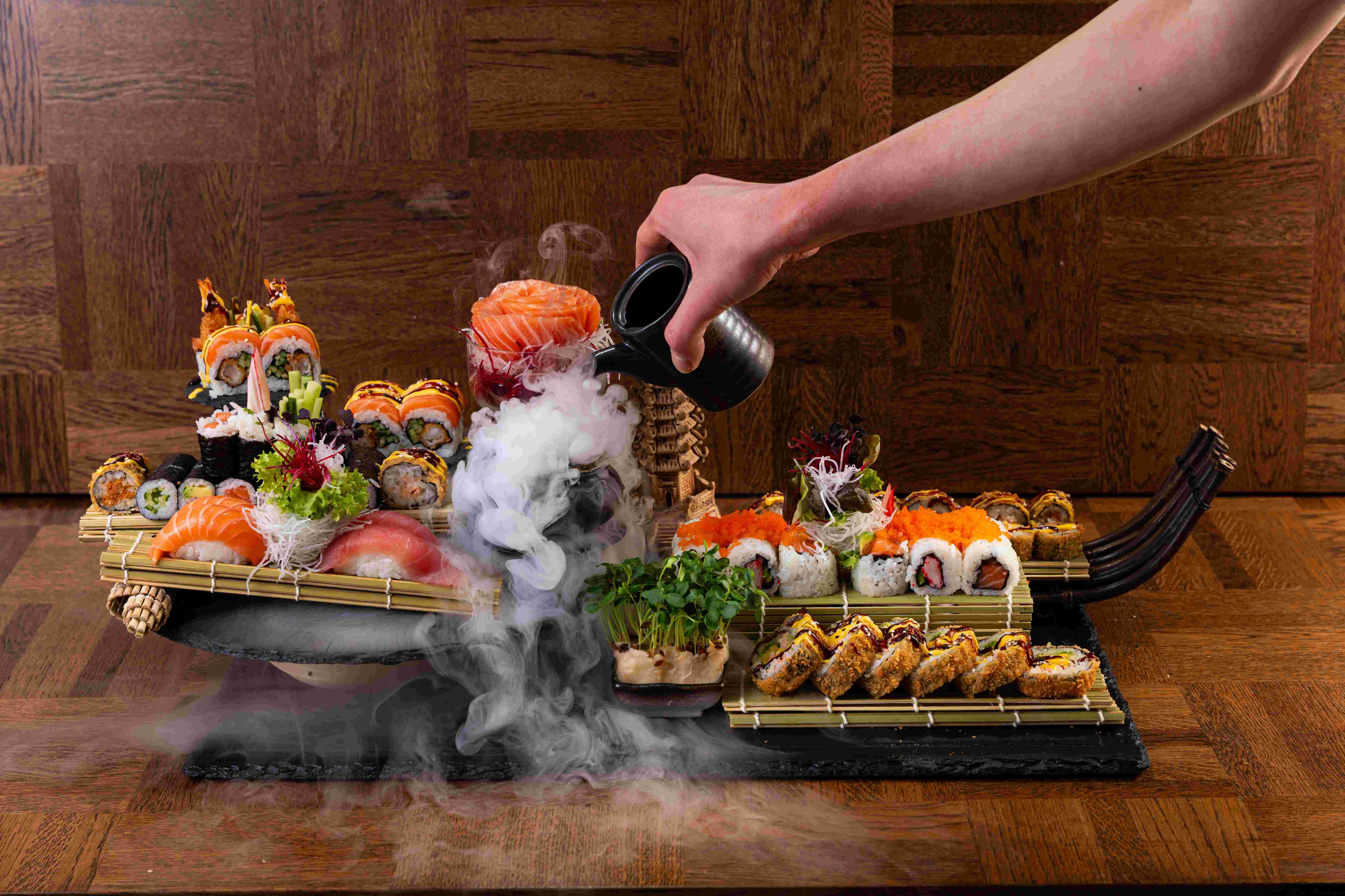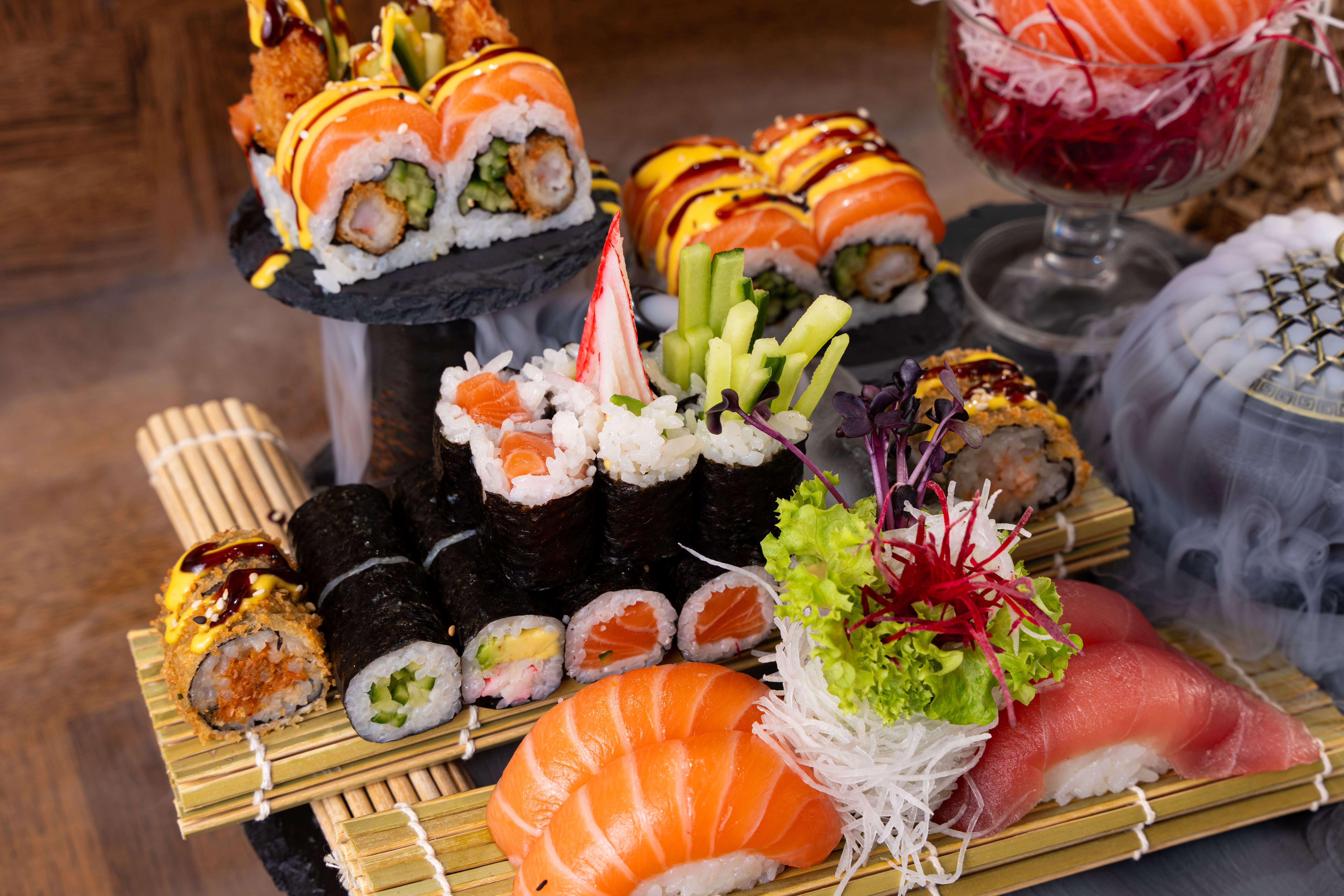 6 Stk. Sake Maki, 6 Stk. California Maki, 6 Stk. Kappa Maki, 8 Stk. Sake I.O, 8 Stk. California I.O, 8 Stk. Sake Mini Rolls, 8 Stk. Spicy Mini Rolls, 8 Stk. Golden Big Rolls, 4 Stk. Nigiri (2 Sake, 2 Maguro), 8 Stk. King Ebi Tempura, 5 Stk. Sake Sashimi