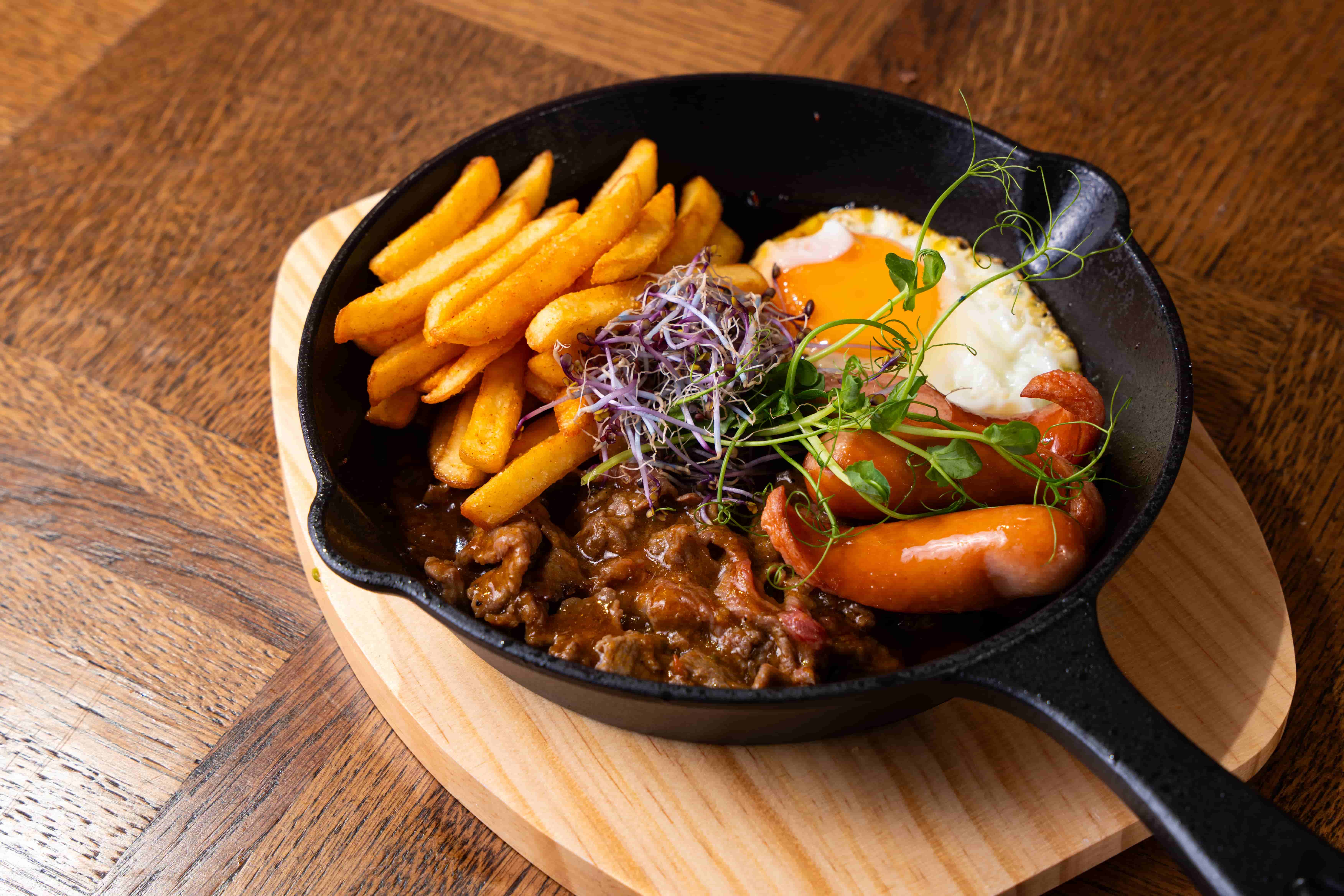 herzhaftes Bánh Mì aus der Pfanne mit Ei,Süßkartoffeln, Würstchen und zartem Rindfleisch,verfeinert mit einer würzigen grünen Pfeffersoße
